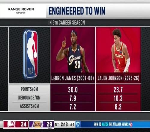 老鹰官推转发核心杰伦与詹姆斯生涯第5季数据对比,杰伦得分逊色,但篮板与助攻均优于同期詹姆斯。
