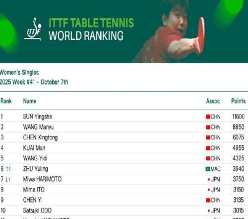 北京时间10月7日,国际乒联第41周世界排名出炉,代表中国澳门参赛的朱雨玲排名第6,反超张本美和成为外协排名最高运动员。男子单打,中国队球员王楚钦、林诗栋位列前二,梁靖崑位列第